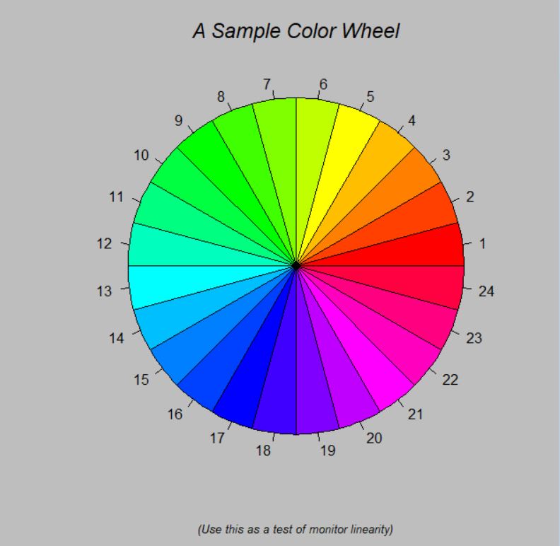 par(bg = "gray") pie(rep(1,24), col = rainbow(24), radius = 0.9) title(main = "A Sample Color Wheel", cex.main = 1.4, font.main = 3) title(xlab = "(Use this as a test of monitor linearity)", cex.lab = 0.8, font.lab = 3)